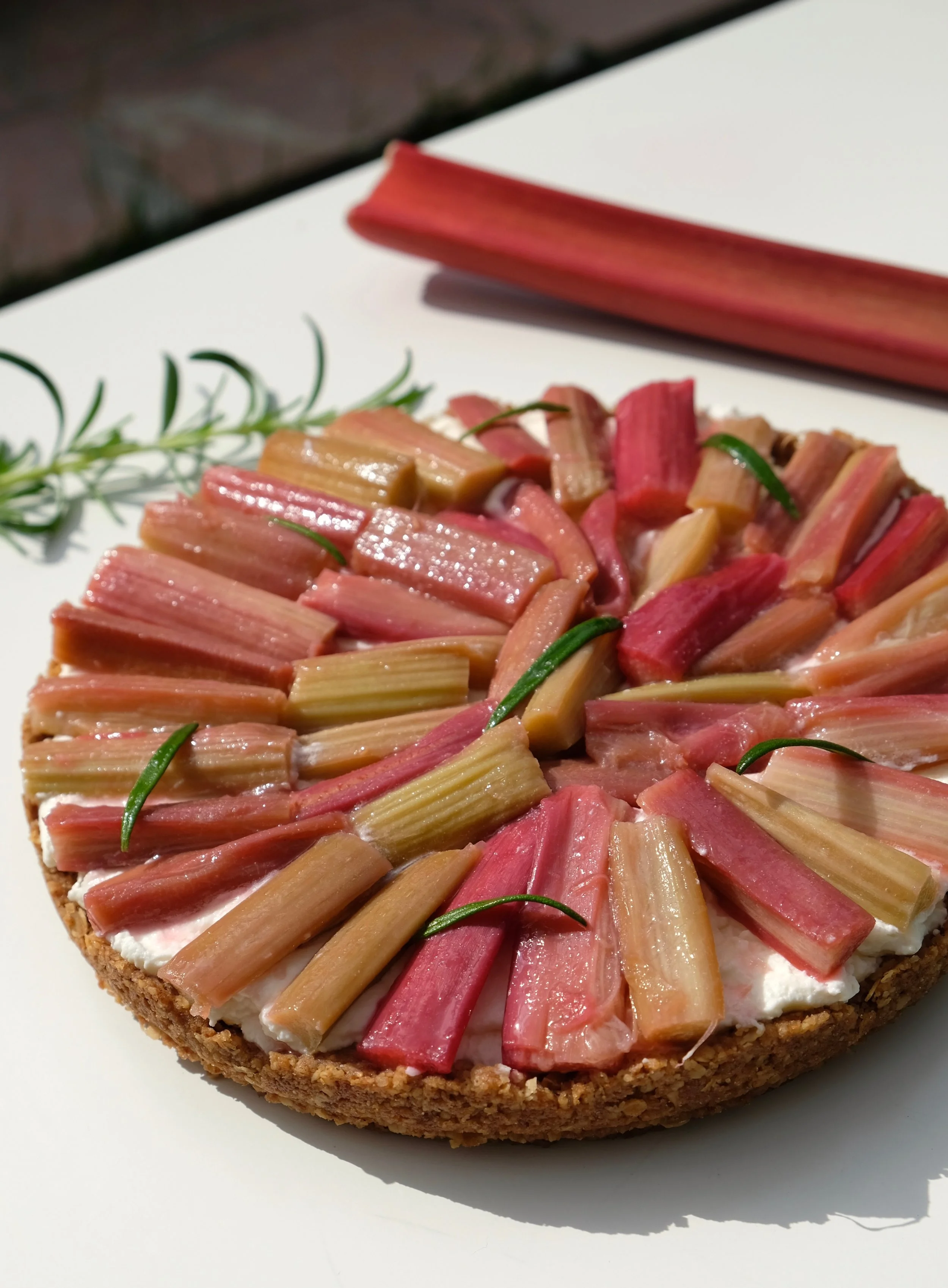 Tarte à la rhubarbe pochée, chantilly et flocons d'avoine